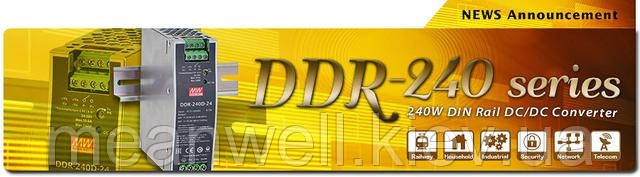 Незабаром після відкриття нового сімейства перетворювачів постійного / постійного струму на DIN-рейці серії DDR-15/30/60/120 MEAN WELL з гордістю оголошує про випуск серії DDR-240 (240 Вт) для забезпечення інтеграції DC / DC на DIN-рейку в додатках з більш високою потужністю. Оскільки серія DDR-240 спроектована для стандартів безпеки залізниць, так і для ITE, вона підходить для використання в системах постійного і змінного струму, таких як промисловий і залізничний контроль, системи контролю безпеки та зв'язку.
